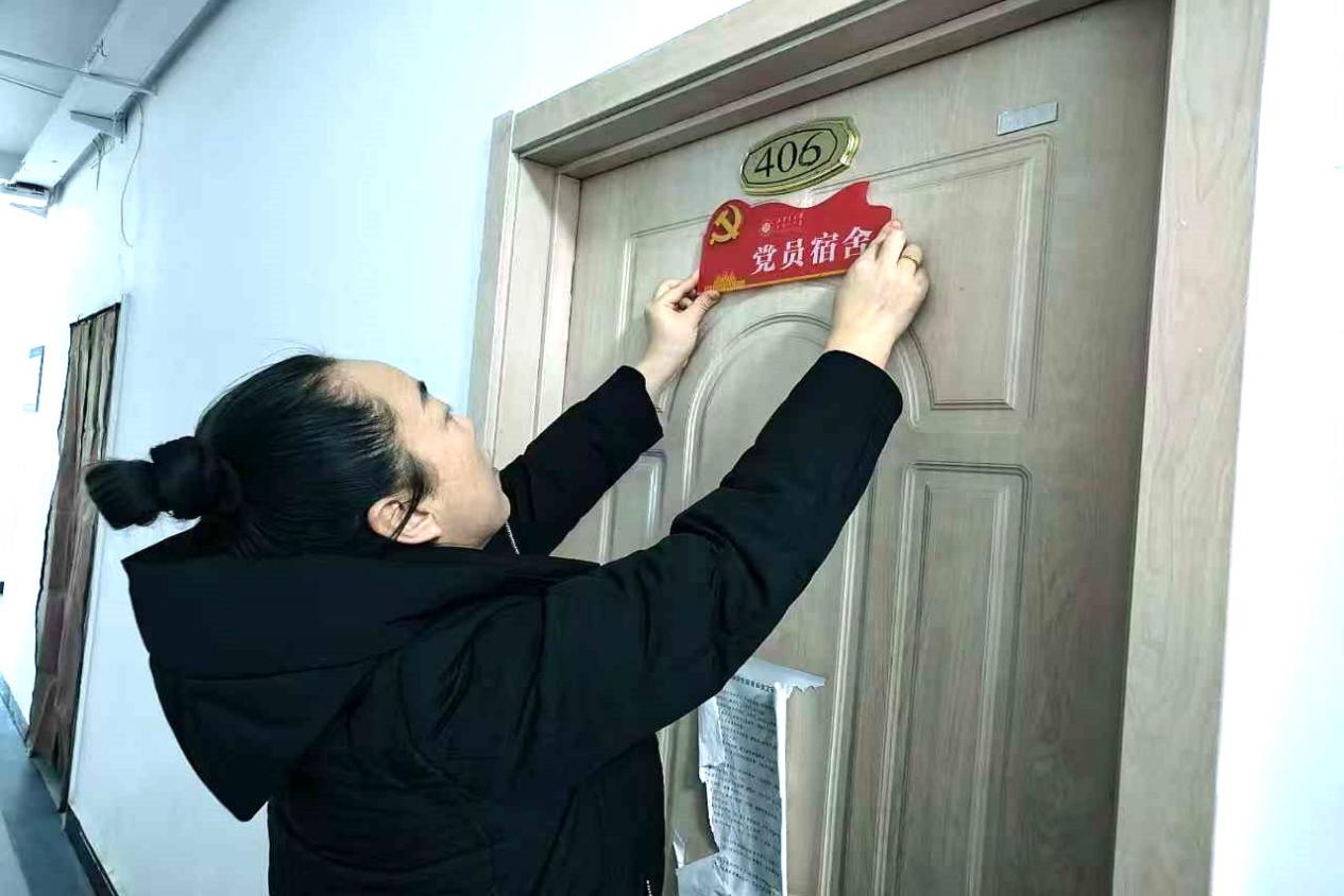 赛罕校区西院5号楼功能型党支部成员为党员宿舍粘贴党员宿舍牌。
