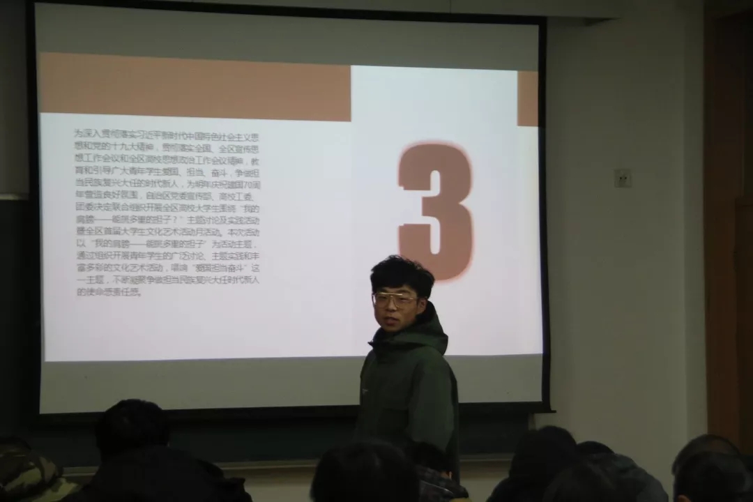 本次活动以“爱祖国,担当奋斗”为主题。活动开始,到场人员全体起立,合唱团歌。之后,梁宇轩同学说明了本次主题团日活动的主要内容,鼓励同学们不断奋斗,增加民族复兴的使命感和责任感,参加社会活动,希望同学们注重学习,只有学到足够多的知识才能在未来更好的投入到新时代下中国的建设中去。