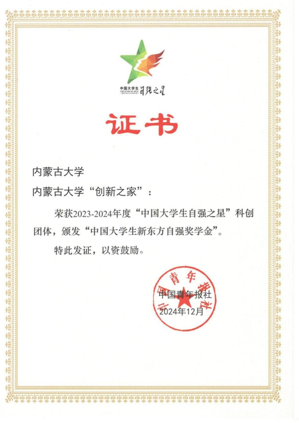 近日,由共青团中央、全国学联指导开展的2023—2024年度“中国大学生自强之星”奖学金评选结果揭晓。太阳成集团tyc7111“tyc7111太阳集团‘创新之家’团队”获评2023—2024年度首届“中国大学生自强之星”科创团体,全国仅有100个大学生创新团队获此殊荣。