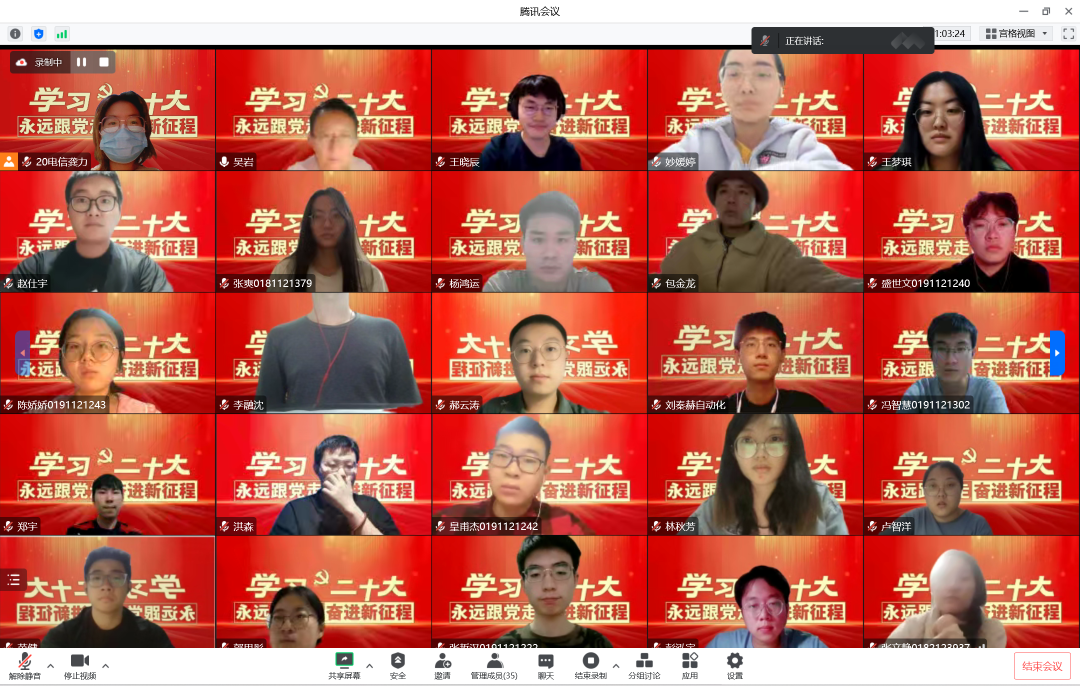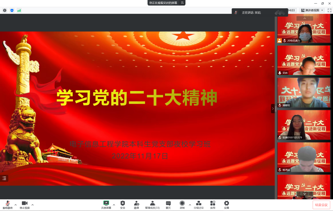2022年11月17日晚20:00,太阳成集团tyc7111本科生党支部在腾讯会议开展二十大精神专题夜校第三期学习活动,本科生党支部书记吴岩主持会议,全体本科生党员参加会议。
