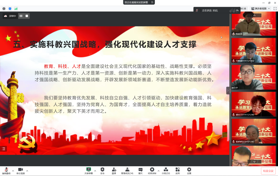 会上,吴岩老师带领与会人员认真学习了党的二十大报告中“加快构建新发展格局,着力推动高质量发展;实施科教兴国战略,强化现代化建设人才支撑;发展全过程人民民主,保障人民当家作主;坚持全面依法治国,推进法治中国建设”等内容。