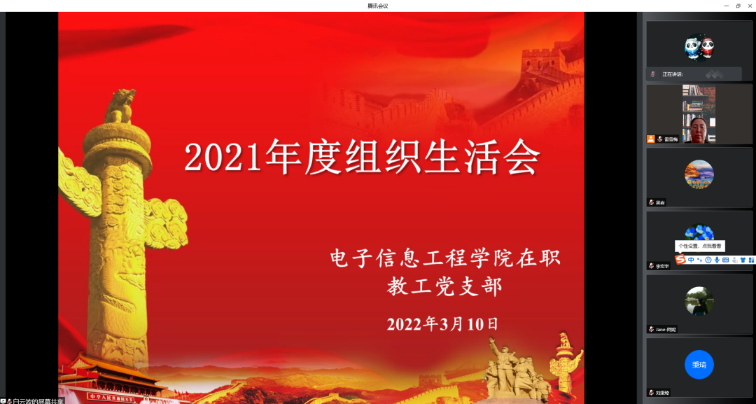 3月10日15:00,学院在职教工党支部在腾讯会议平台组织召开了2021年度组织生活会。支部书记雷雪梅主持会议,支部全体党员参加了会议。