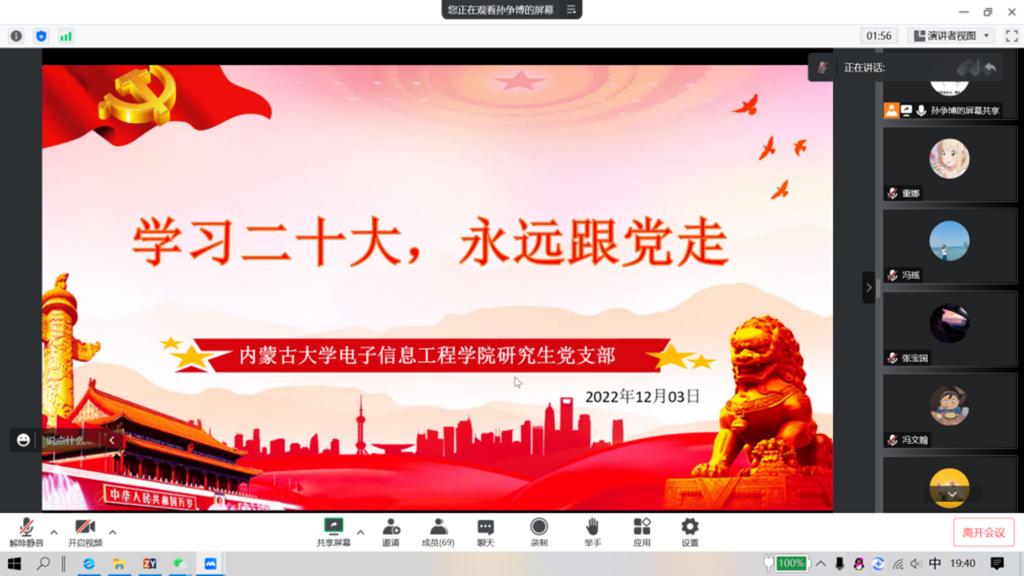 2022年12月3日晚19:30,太阳成集团tyc7111研究生党支部在腾讯会议开展了第三期“学习二十大,永远跟党走”集中学习,本次集中学习由研究生第三党支部组织委员孙争博主持,研究生党支部书记白云波及全体研究生党员参加学习。