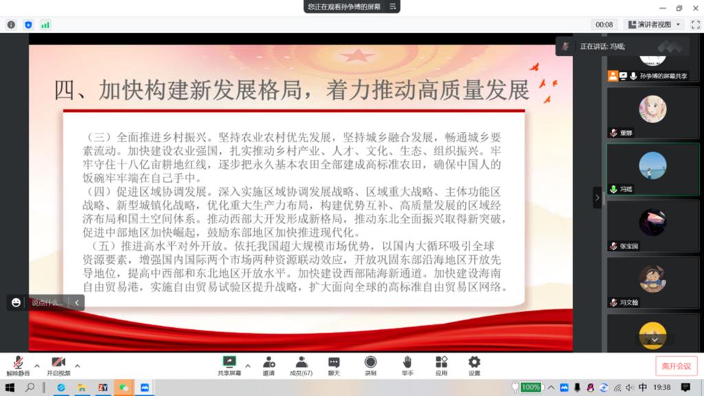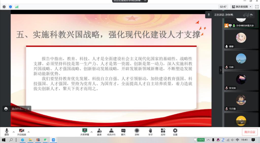 孙争博组织研二、研三年级党小组组长分别诵读党的二十大报告中第四部分“加快构建新发展格局,着力推动高质量发展”和第五部分“实施科教兴国战略,强化现代化建设人才支撑”等内容,并观看专题纪录片《团代表委员学习党的二十大精神》。
