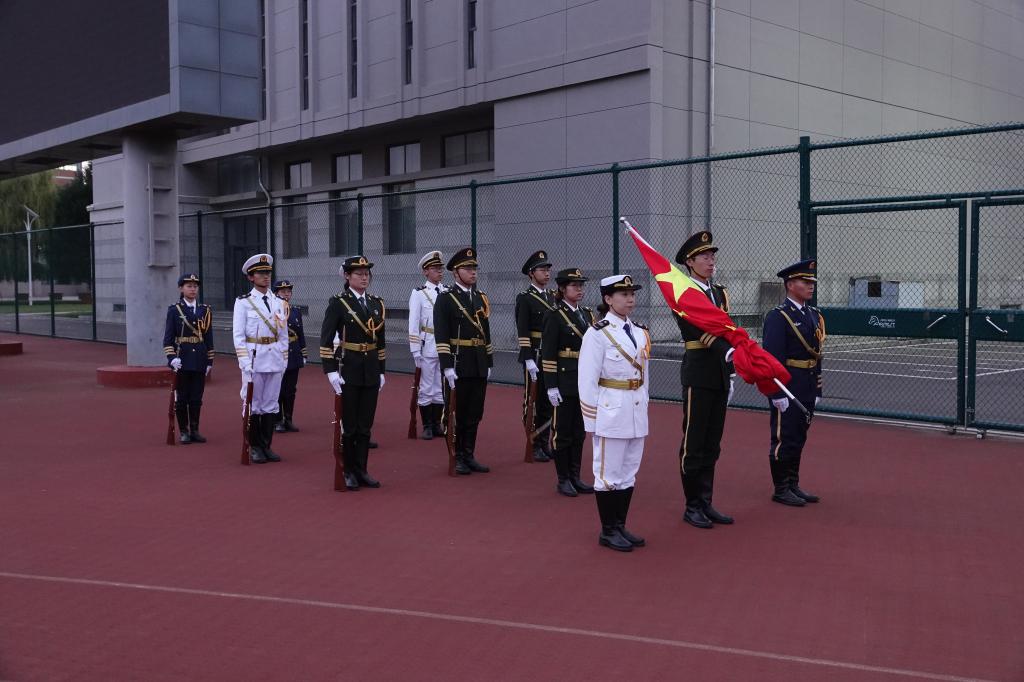 随着升旗仪式开始,国旗护卫队的队员们身着整齐划一的制服,眼神坚定庄严,出旗步伐铿锵有力。当熟悉的《义勇军进行曲》旋律响起,全体同学肃立,行注目礼,齐声高唱国歌,歌声嘹亮激昂,响彻清晨的校园。国旗在国歌声中冉冉升起,伴着晨光,随风飘扬。