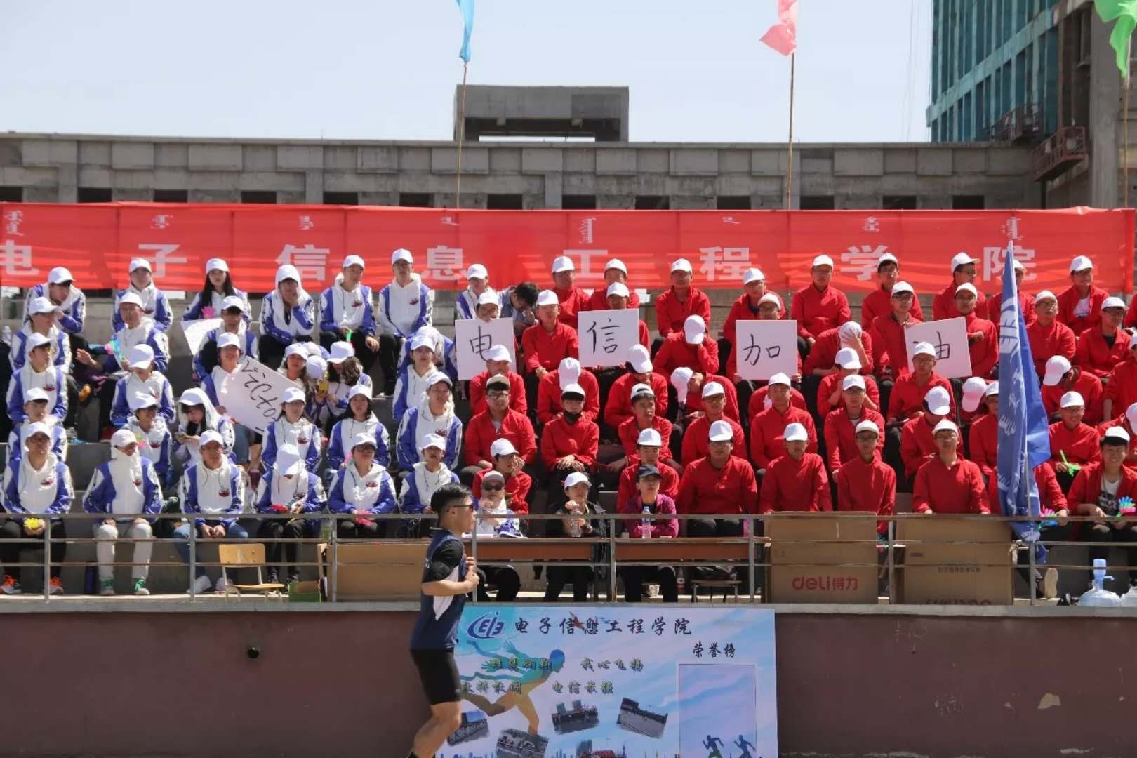 春风拂面,柳絮飘飞,骄阳烈烈;运动员们在运动场上激情四射,竭力拼搏;观众们的呐喊与掌声,让运动员们信心满满。功夫不负有心人,运动员们三个月的春训,在运动会第一天就已取得了优异的成绩。