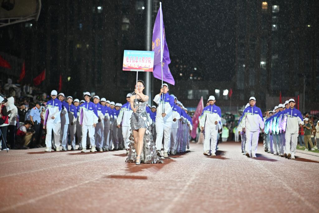 方阵表演中,同学们整齐的队列借助双色方块排布成各式图案,身着银色服装的同学进行机械舞表演。虽然大雨滂沱,他们仍然认真完成了舞蹈和队形,配合着动感的音乐节奏,动作流畅,每一个转身都精准而富有力量。