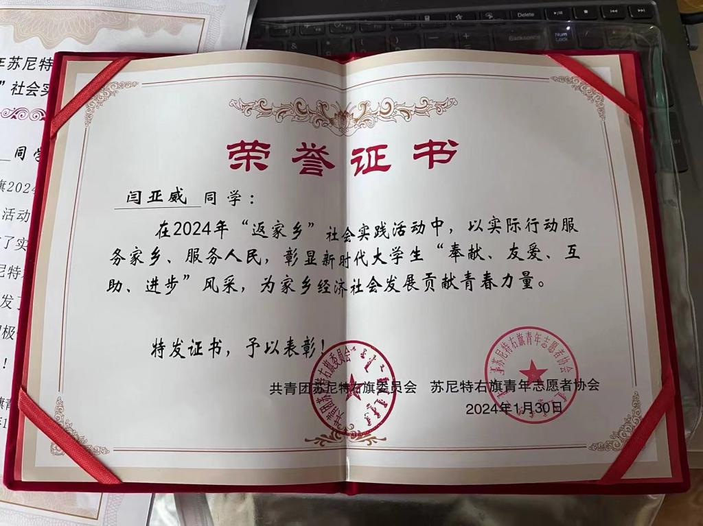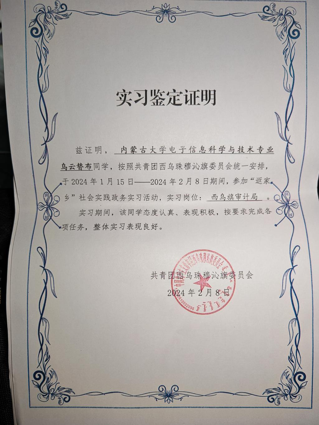 23级电信一班闫亚威报名参加了共青团苏尼特右旗办公室工作,22级电子信息科学与技术专业乌云替布在共青团乌珠穆沁旗西乌旗审计局办公室做文秘,负责收文,发文,登记,打印,传阅,整理等工作。